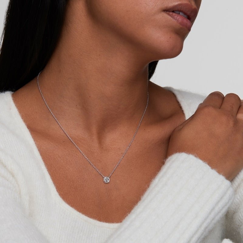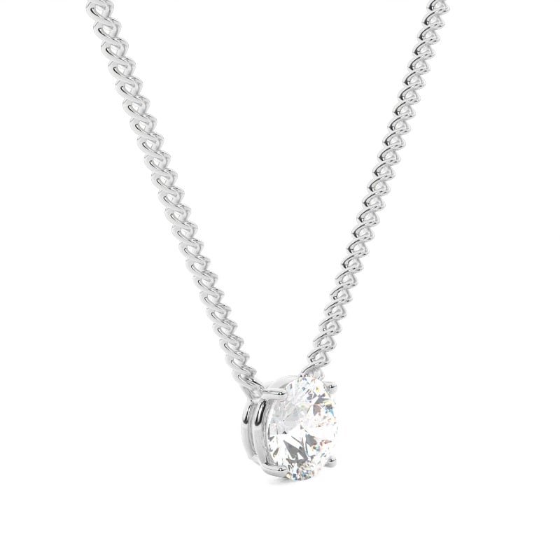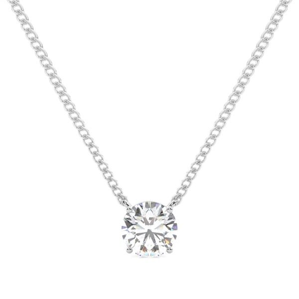 Our Solitaire Pendant features a 0.100 ct.wt. G SI1 Round Lab-Created Diamond in a Prong. Crafted in 9K White Gold, this pendant combines precision craftsmanship with clean lines and timeless design. The calibrated prongs secure the diamond while maximising light reflection for optimal brilliance.